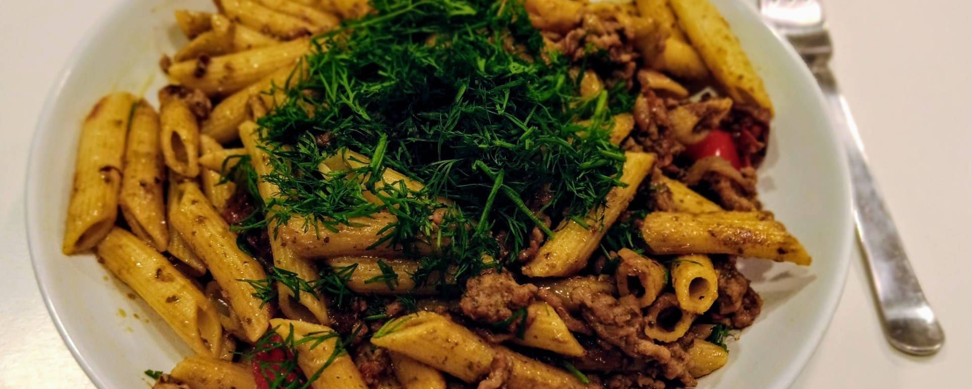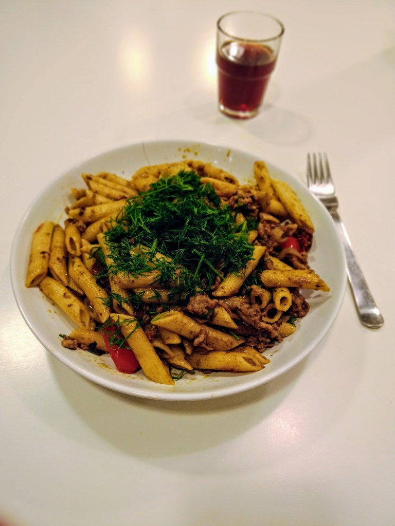 Today I was lucky and managed to fix myself delicious Italian pasta with ground meat and green pesto sauce. It is a shame I had no one to share my meal with.