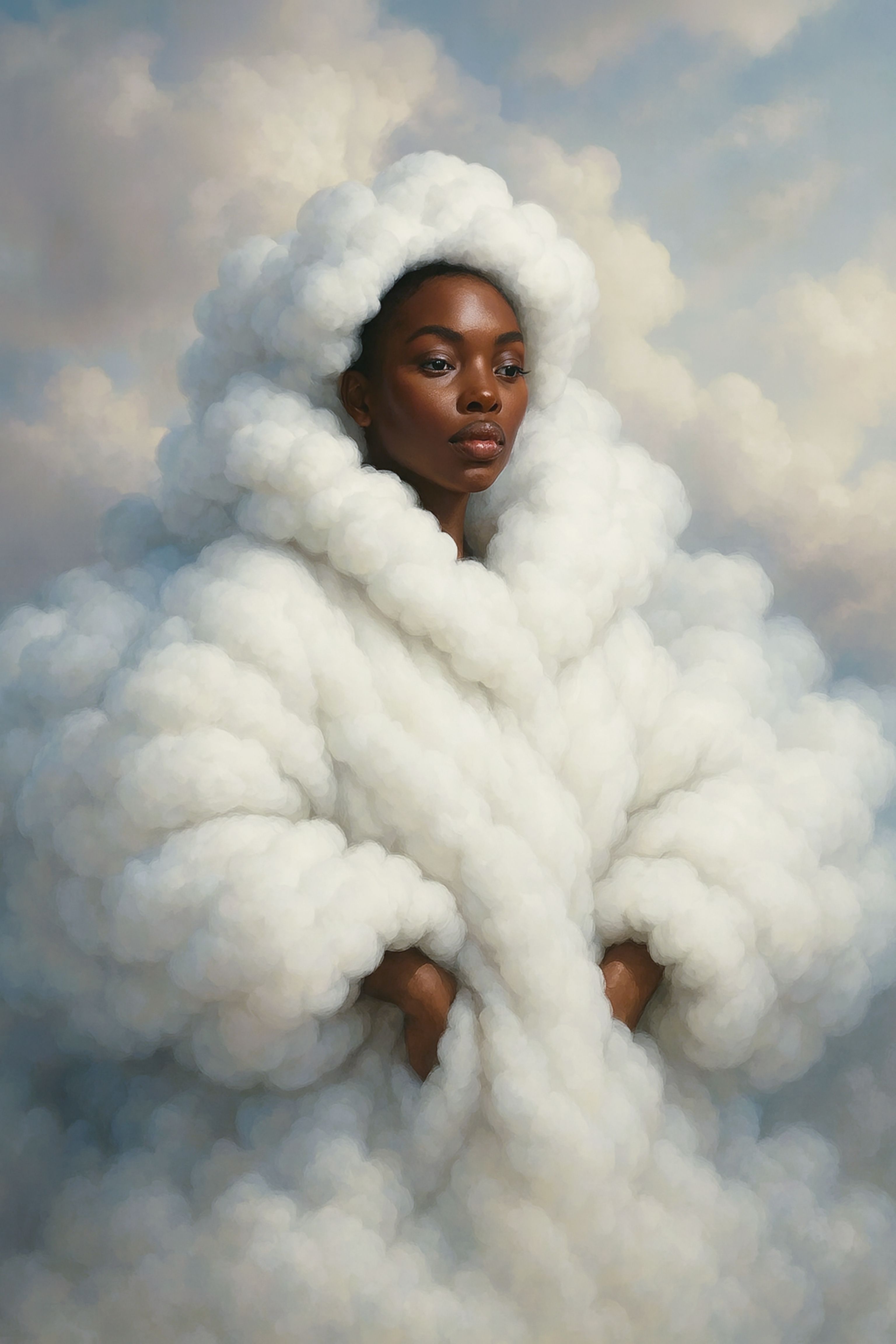 Long ago, in a village perched on the edge of the sky, there lived a girl who refused to wear wool or fur in the winter. She said the earth’s fabrics were too heavy, too bound to the soil. Instead, she climbed the tallest hill at dawn and whispered to the heavens. The clouds, curious and playful, drifted down to her shoulders. They wrapped around her like a coat, soft and luminous, stitched together by sunlight and wind.