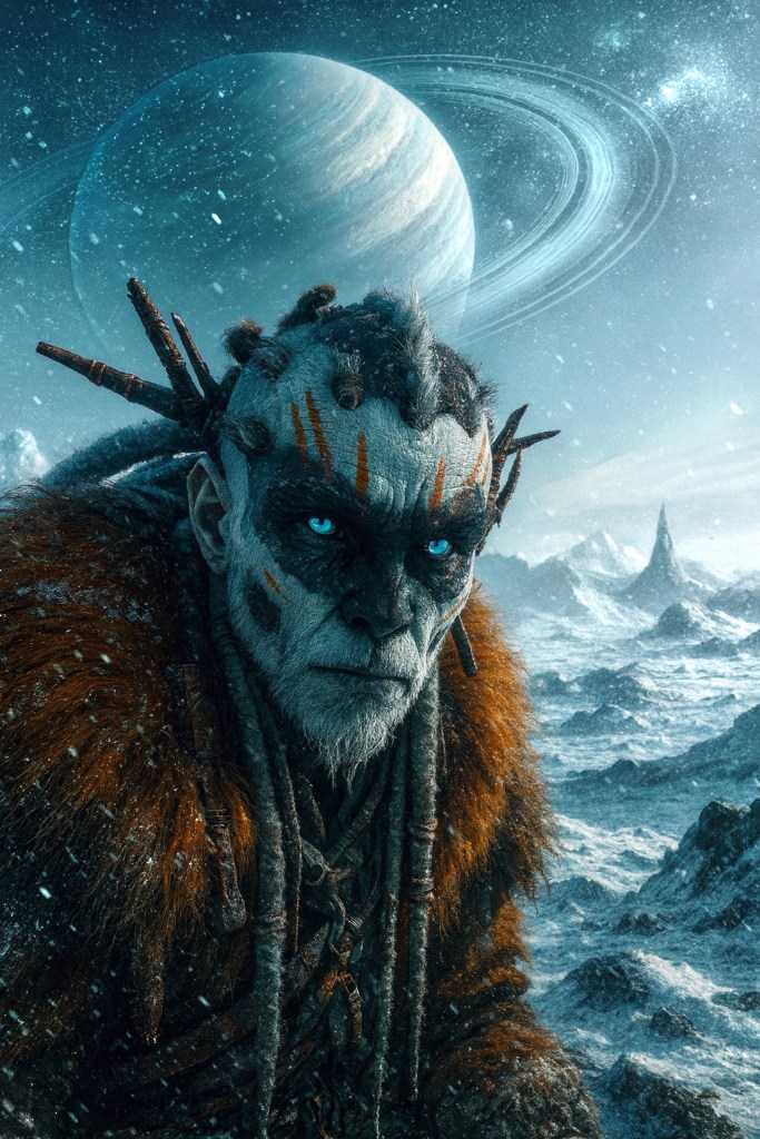 He was born beneath the geysers of Enceladus, where plumes of ice and vapor erupt into Saturn’s shadowed sky. His tribe believed the moon itself carved him from frost and flame. It gifted him glowing feline eyes to pierce the blizzards. They help him see prey hidden in the shimmering snow. He took his first breath in a cave of crystal spires. His cries echoed like thunder across the frozen plains.