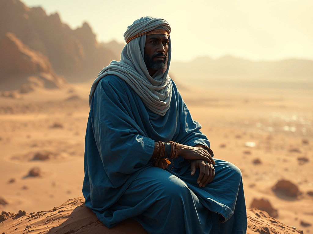 - His ultramarine robes are not decorationโthey are identity, a shard of sky carried into a red world.